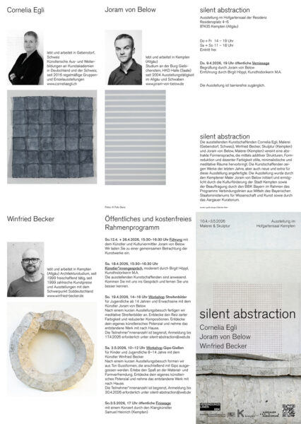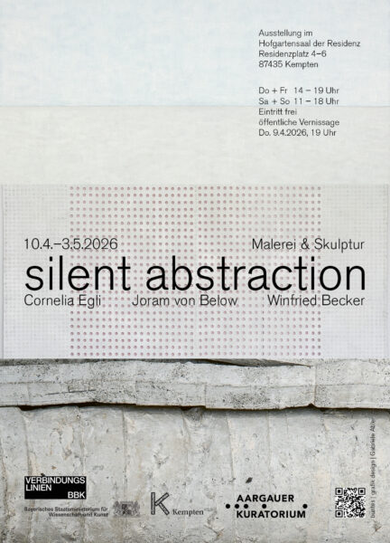 Die ausstellenden Kunstschaffenden Cornelia Egli, Malerei (Gebenstorf, Schweiz), Winfried Becker, Skulptur (Kempten) und Joram von Below, Malerei (Kempten) vereint eine abstrakte Formensprache, die mittels additiver Strukturen, Formreduktion und dezenter Farbigkeit stille, minimalistische und meditative Räume hervorbringt. Die Kunstschaffenden zeigen Werke der letzten Jahre, aber auch neue und extra für diese Ausstellung angefertigte. Die Ausstellung wurde durch den Kemptener Maler Joram von Below initiiert und ermöglicht durch die Kulturförderung der Stadt Kempten sowie der Beauftragung durch den BBK Bayern im Rahmen des Programms Verbindungslinien aus Mitteln des Bayerischen Staatsministeriums für Wissenschaft und Kunst sowie durch das Aargauer Kuratorium.